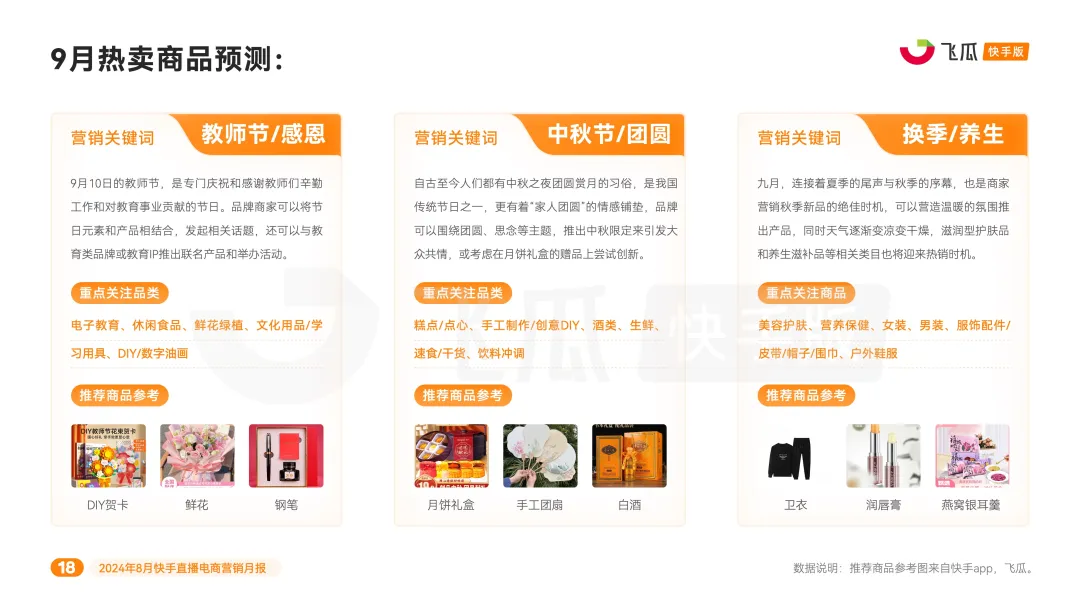 步入九月,教師節和中秋節為市場注入了濃厚的送禮熱潮,帶動禮盒等禮品類商品銷量顯著攀升。在此時機下,品牌商家可圍繞節日元素髮起相關話題營銷活動,來放大聲量以提升曝光度和銷量增長。