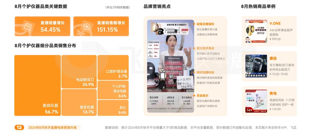 隨着現代消費者觀念的革新,人們日益將購物注意力轉向追求生活品質的提升,這一趨勢極大地促進了個護儀器品類的蓬勃發展。據飛瓜顯示,8月個護儀器直播銷量、銷售額環比上月分別增長了54.45%、151.15%,其中美容儀器GMV領先,佔比近六成。