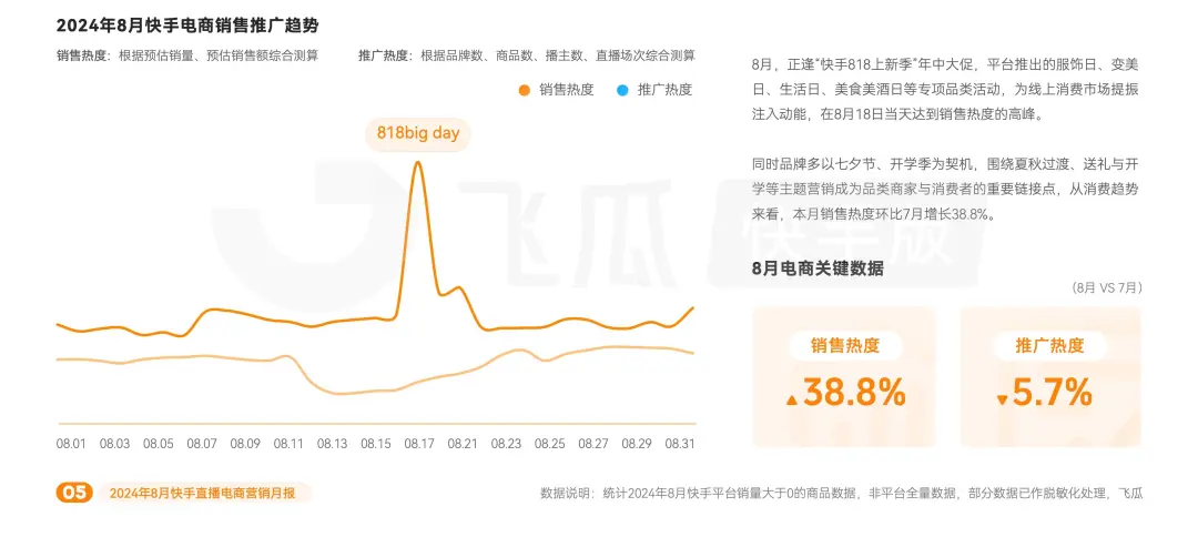 從銷售熱度來看,銷售熱度環比7月增長38.8%,電商整體銷售勢頭向好。“快手818上新季”,平台推出的服飾日、變美日、生活日、美食美酒日等專項品類活動,為線上消費市場提振注入動能,在8月18日當天達到銷售熱度的高峯。
