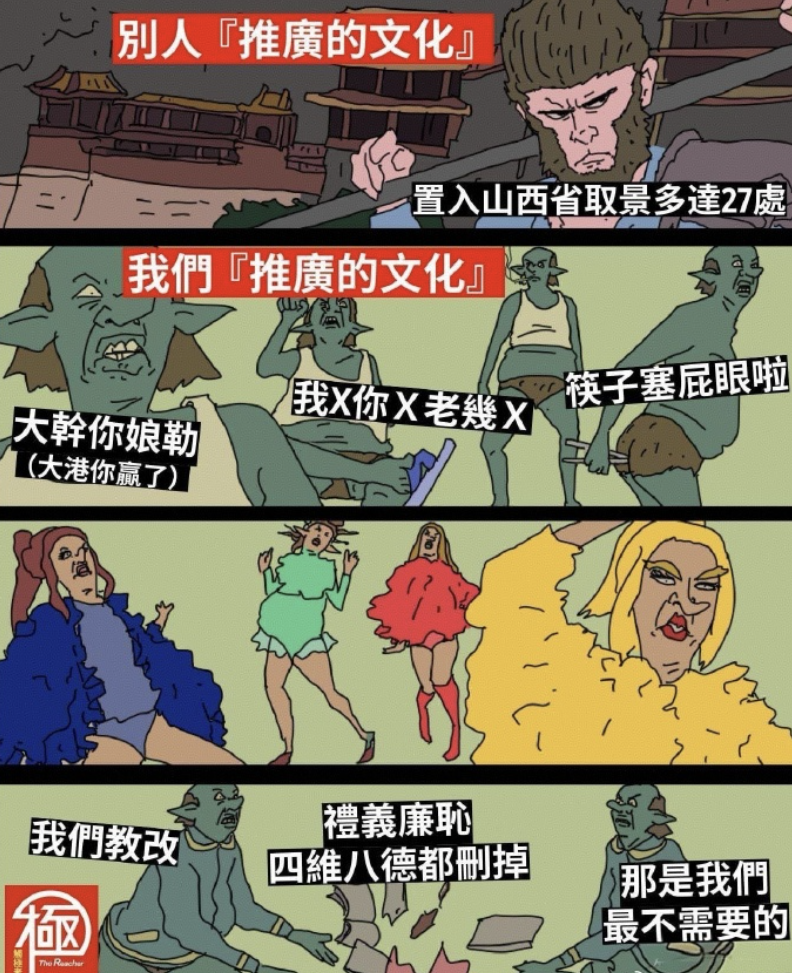 有人講“傳統文化認同”,其實倒並不是,因為台灣年輕人在長期的去中國化洗腦信息繭房下,對於中國傳統文化毫無認知,基本上都是文盲……他們對《西遊記》的認知,還不如越南、馬來西亞、印尼和新加坡。