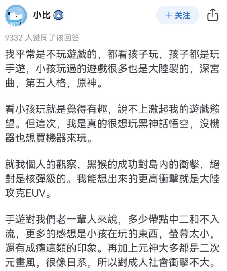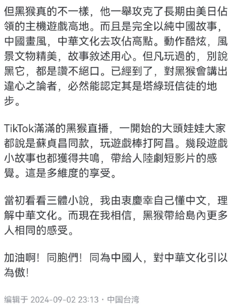 其實台灣人對《黑神話:悟空》的心態很有意思,很多人不得不承認,這是非常成功的單機遊戲作品,因為台灣年輕人都是打電玩的,見得多了,明白這部遊戲所代表的水平和文化價值。