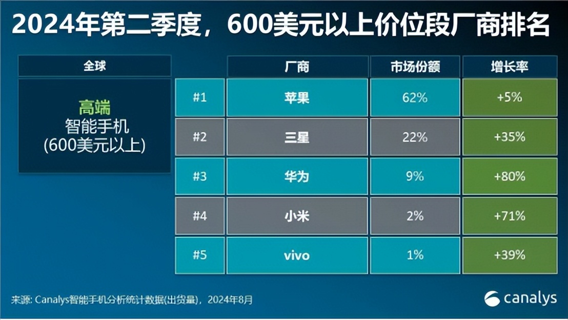 Canalys數據顯示,今年第二季度,全球高端智能手機市場出貨量排名前五的廠商分別是:蘋果、三星、華為、小米、vivo,雖然蘋果依然是市場第一,但華為正以80%的市場增速在追趕。