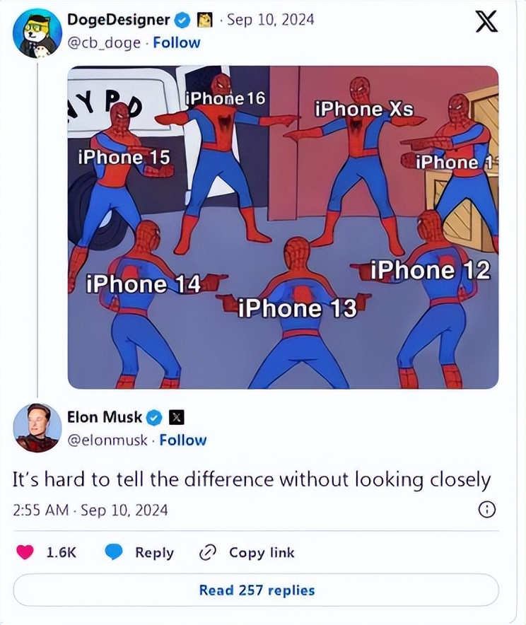 但目前來看,資本市場對iPhone 16似乎並不“感冒”。新品發佈後,蘋果美股盤前報價甚至下跌了1.43%。馬斯克甚至在X上回應網友吐槽,暗指蘋果花了500億元,但新品卻缺乏創意。