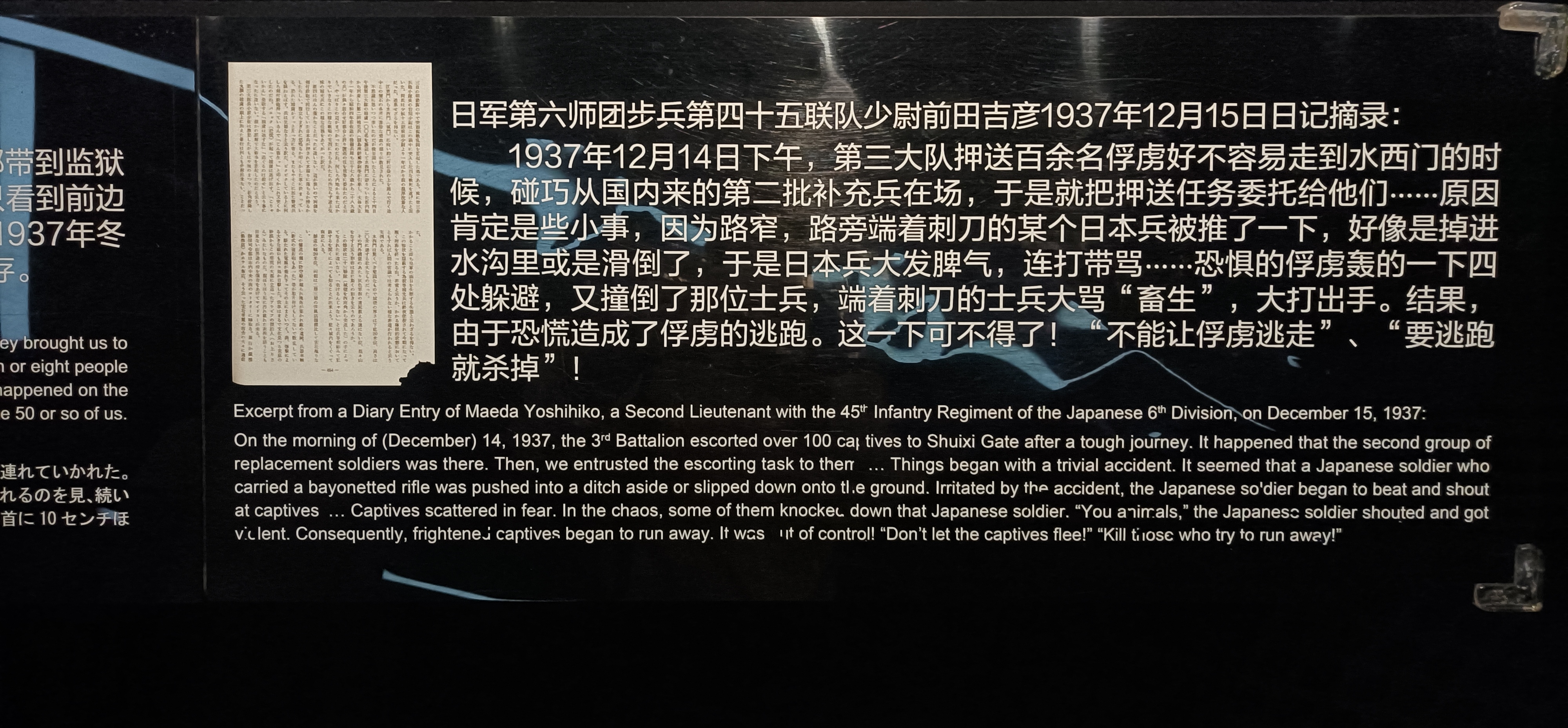 比如,1937年12月15日,日軍第六師團步兵第四十五聯隊少尉前田吉彥在日記中記載 ,14日下午,第三大隊押送百餘名俘虜走到水西門時,有日本兵滑倒,大發脾氣,……恐懼的俘虜轟的一下四處躲避……。