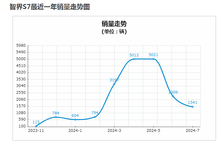 此後,在今年4月份智界S7二次發佈,上市後的第一個完整月份,銷量還突破了五千輛,也還算不錯,但是此後便開始下滑。5月至7月的交付量分別為5021輛、2306輛和1541輛,連續三個月下滑。面對如此嚴峻的市場形勢,智界品牌的前景無疑蒙上了一層陰影。