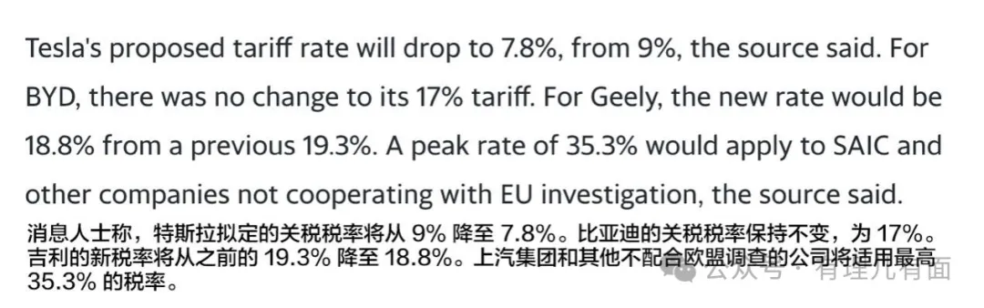 然而,劇情並未就此落幕。9月10日,歐盟上演了一場税率調整的“戲中戲”,以終裁前的“小預告”為噱頭,對已如巨石壓胸的税率進行了一場“微妙”的“瘦身”,比亞迪的關税税率保持不變,為 17%;吉利的新税率將從之前的 19.3% 降至 18.8%;至於上汽集團及對歐盟調查“不屑一顧”的企業,迎接它們的則是史無前例的35.3%税率的“頂級待遇”。