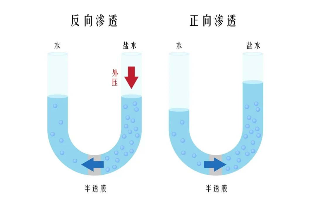 正如高中生物課所講,如果半透膜兩側的液體存在滲透壓差,那麼水分子會從低溶質濃度的一側(如清水),自發進入高溶質濃度的一側(如鹽水),這個過程就叫做正向滲透。