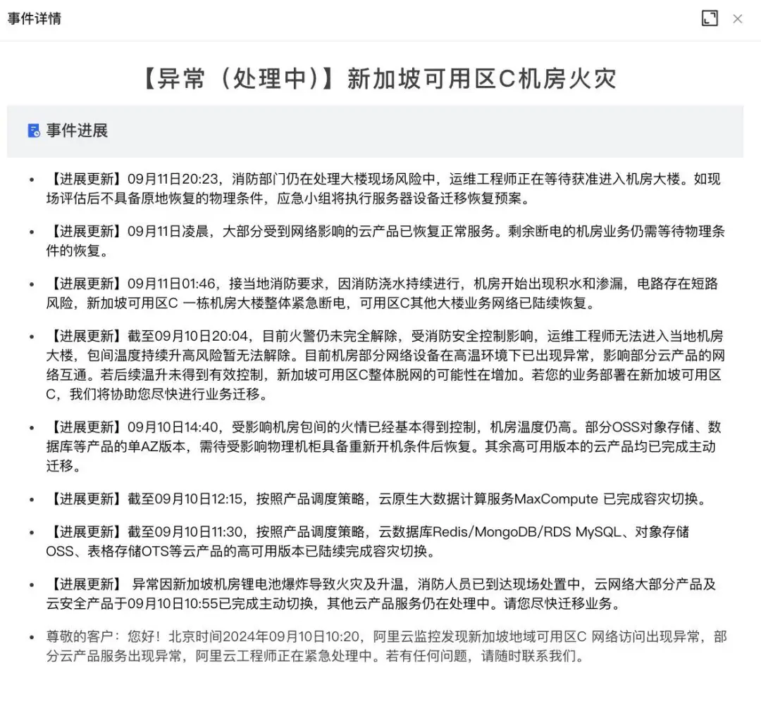 後續發佈的更新指出,“此次異常是由新加坡數據中心的鋰電池爆炸引發,爆炸導致現場起火及温度升高。”