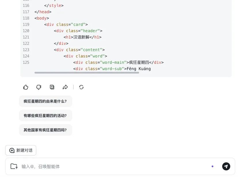 李繼剛大佬這段咒語是直接用在 Claude 3.5 Sonnet 上的,直接複製扔到聊天框裏, Sonnet 就會識別出來這是讓它搞智能體,然後自動運行,你輸入啥詞人家完了以後就給你啥代碼,然後複製到編譯器,就能看到輸出的圖片了。