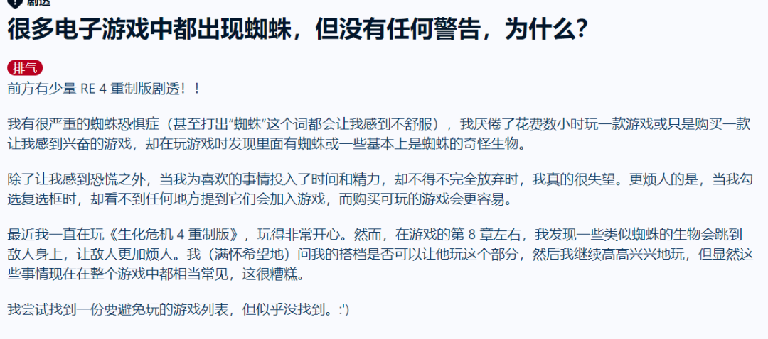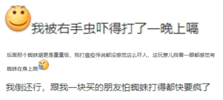怕蜘蛛這事屬於主觀感受,人與人之間的感受天差地別,中間的隔閡三言兩語也解釋不清。經常有人求問遊戲有沒有蜘蛛,結果被人嘲諷為矯情:“怕蜘蛛別玩不就行了,哪來那麼多事”。