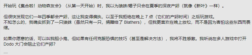全年齡向的遊戲也跑不掉,前幾年《動森》爆火後,人們發現裏面的昆蟲還挺擬真,尤其是晚上的狼蛛,碰巧狼蛛是前期最值錢的生物,錯過就是一大筆損失,對怕蜘蛛的人來説,大抵就是“要錢還是要命”的感覺。