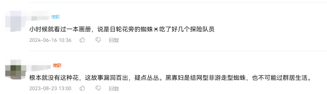 有一個印象深刻的偽科普我至今難忘,叫做《日輪花和黑寡婦蛛》,故事裏寫着兩者是共生關係,日輪花的葉片力量非比尋常,能把人一下拖倒在地,然後躲在一旁的黑寡婦蛛趁機下口,蛛羣將人吸成乾屍。如此三流的恐怖片劇本,過去卻頻頻出現在所謂的科普讀物裏,多少也要為這些恐懼症承擔責任。