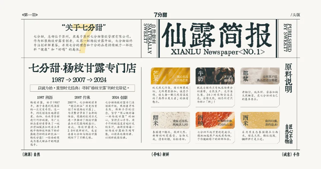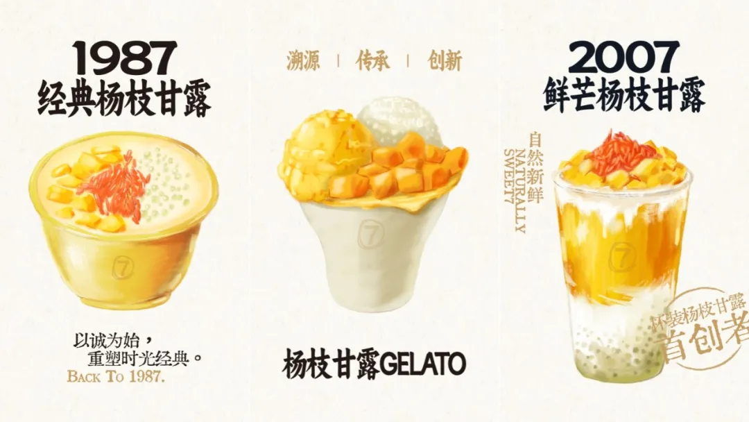產品“1987經典楊枝甘露”中的1987,是楊枝甘露產品誕生的時間,復刻經典致敬經典。2007年是杯裝楊枝甘露在7分甜誕生的年份,“2007鮮芒楊枝甘露”傳遞品牌的創新精神。