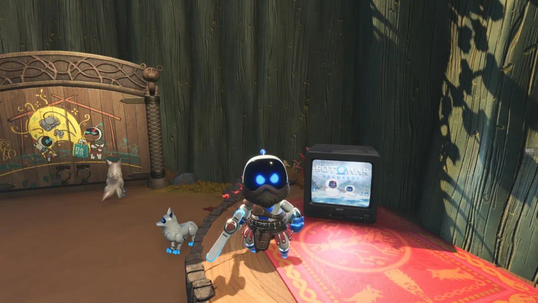 實際上,這種串聯多個作品的內容不止是彩蛋,許多關卡甚至直接借用了其他遊戲的玩法,讓小機器人連內核都徹底“模仿”了出來。主角時而像奎託斯那樣深蹲開箱、扔出飛斧,時而經歷“神秘海域”中邊走邊塌的遭遇,還會像勞拉一樣探訪古墓。在某一關中,遊戲從美術風格到玩法再到關卡設計,近乎完美地復刻了《樂克樂克》。