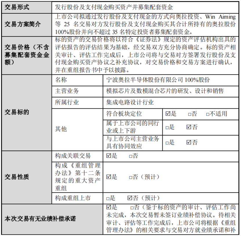 格隆匯獲悉,9月10日晚,上市公司雙成藥業(002693.SZ)發佈了《海南雙成藥業股份有限公司發行股份及支付現金購買資產並募集配套資金暨關聯交易預案》(以下簡稱“收購預案”),擬以發行股份及支付現金的方式收購寧波奧拉半導體股份有限公司(以下簡稱“奧拉半導體”)100%的股份。