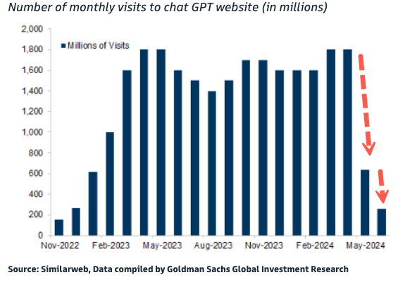 就在上週末,一張來路不明、顯示Chat-GPT訪問量斷崖式下跌的圖就引發了華爾街的一陣動盪,緊跟着就是英偉達、谷歌、亞馬遜、Meta這些AI企業的股價下跌。