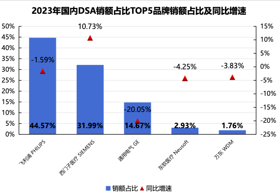 而在一些更高精尖的領域,國產設備的存在感還相對有限。最典型的就是血管造影X射線機(DSA)市場,2023年我國DSA國產化率(銷量)只有10%左右,從銷售額來看,這一比率則只有6.63%。其中,頭部企業東軟醫療市場佔有率不到3%,萬東醫療更是不到2%,GPS三巨頭仍把持着超90%的市場份額。