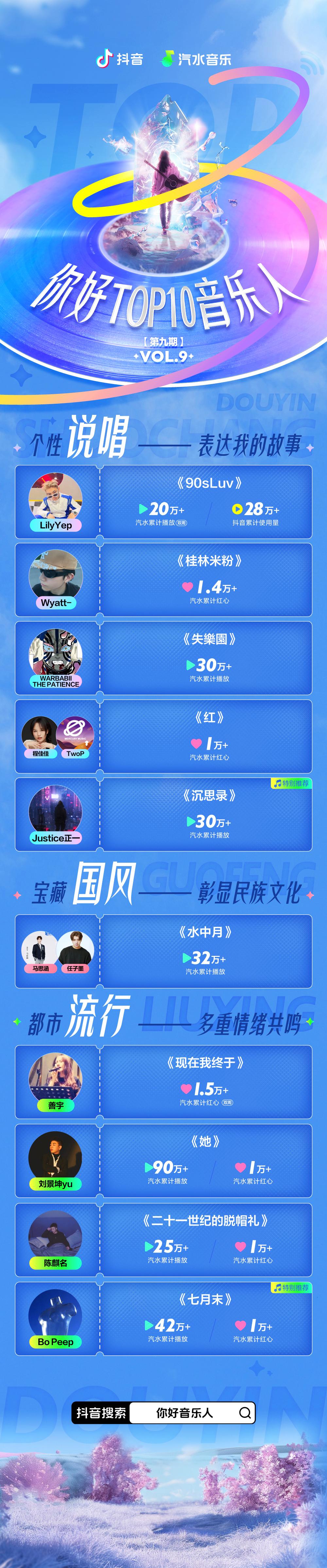 此外,當歌曲在抖音使用量突破2000,便有機會匹配專屬推歌管家,獲得百萬粉絲達人推歌、熱榜話題、Dou+加熱,更有現金激勵不斷;當歌曲入選每雙週評選的「你好TOP 10音樂人」後,還將獲得汽水banner、歌單等專屬資源位和加熱流量包,助力真正打造成出圈的全網爆款。