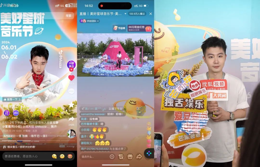 例如,在「美好星球音樂節」上,抖音就為Mozza、劉大壯、董嘉鴻等5位音樂人打造了專屬的音樂節演出+直播舞台,演出直播吸引了超376萬人的觀看。與此同時,精華混剪帶動高質量的二次傳播,#你好音樂人音樂節寶藏現場 登上升熱點,總曝光達到476.5萬+。