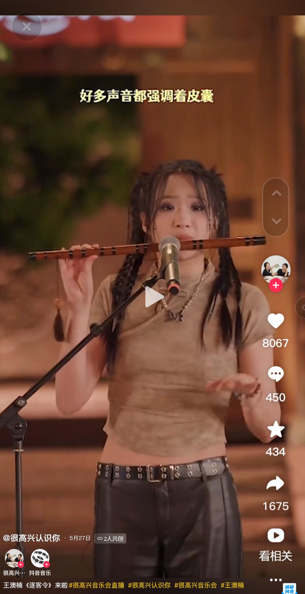 此外,今年依靠竹笛與説唱的搭配驚豔全網的音樂人王澳楠,更是受到了「很高興音樂會」、「美好星球音樂節」、「出發!——2024抖音仲夏畢業歌會」等多個官方官方邀請。以「很高興音樂會」為例,她不僅在直播同期借力「很高興認識你」的IP走向更多受眾,而且在直播結束後,獲得@很高興認識你、@抖音音樂等官方賬號的聯合視頻創作,幫助音樂人進一步推廣音樂作品,獲得更多主流曝光。