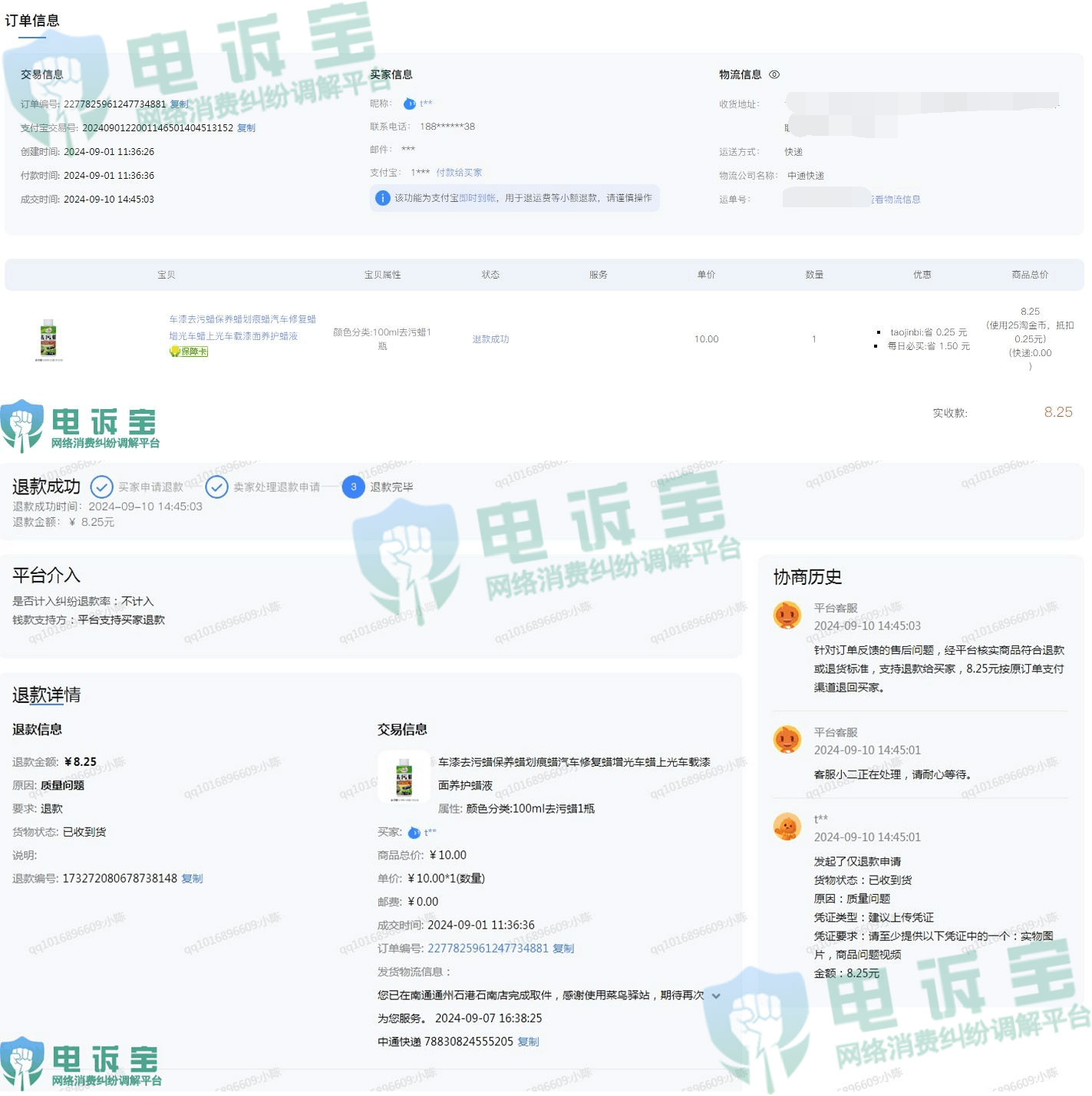 9月10日,淘寶平台上一汽車用品商家陳先生向“電訴寶”投訴稱,其於2024年9月10號在淘寶電商平台經歷了不合理的“僅退款”判定,買家在收到商品之後,在未向商家客服反饋任何售後信息(沒有任何於商家客服的聊天記錄)的情況下直接申請“僅退款”,平台未經商家同意,且在商家不知情的情況下為買家“僅退款”。