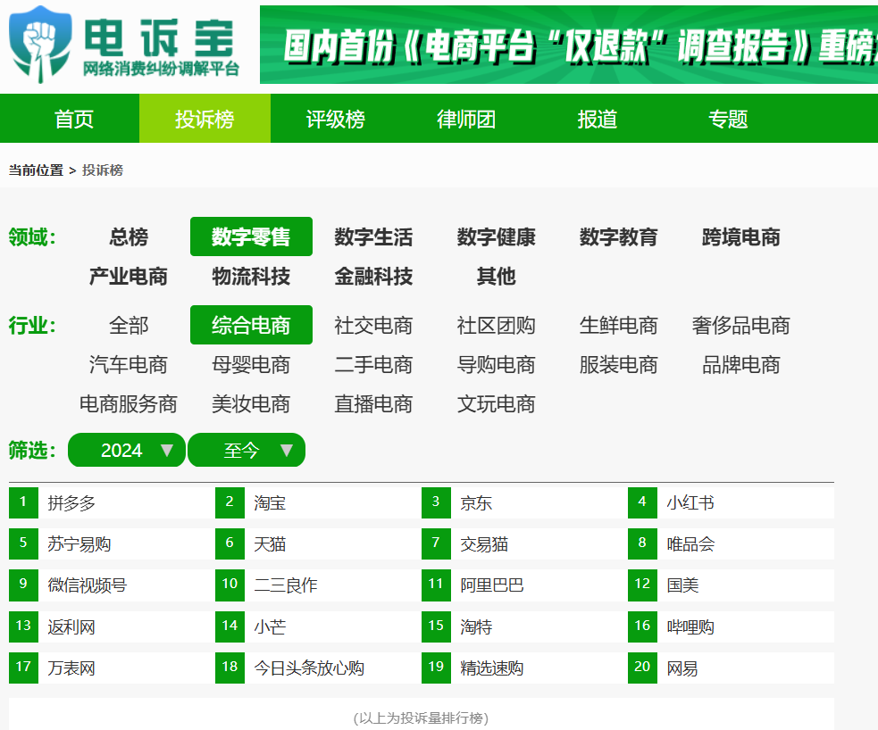 根據“電訴寶”受理的綜合電商領域用户有效投訴顯示(依據投訴量排行),淘寶排名第二位,最新評級為“不予評級”。同樣被投訴的綜合電商領域平台依次為:拼多多、京東、小紅書、蘇寧易購、天貓、交易貓、唯品會、微信視頻號、二三良作、阿里巴巴、國美、返利網、小芒、淘特、嗶哩購、萬表網、今日頭條放心購、精選速購、網易。