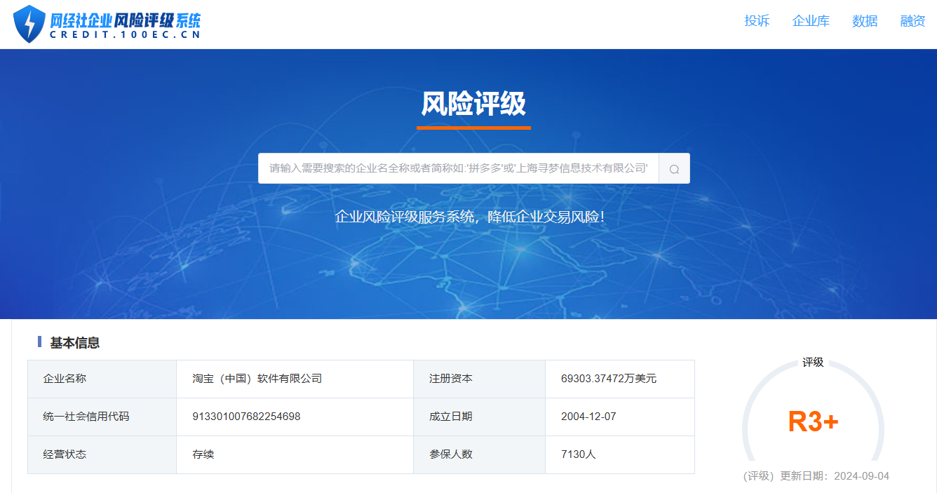 據網經社“企業風險評級系統”顯示,“淘寶”所屬淘寶(中國)軟件有限公司的風險評級為R3+,公司目前所處高風險。