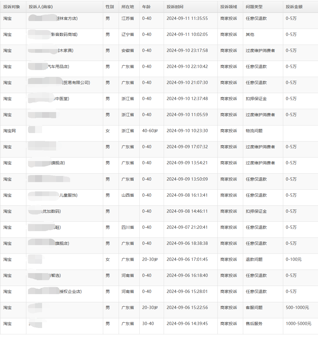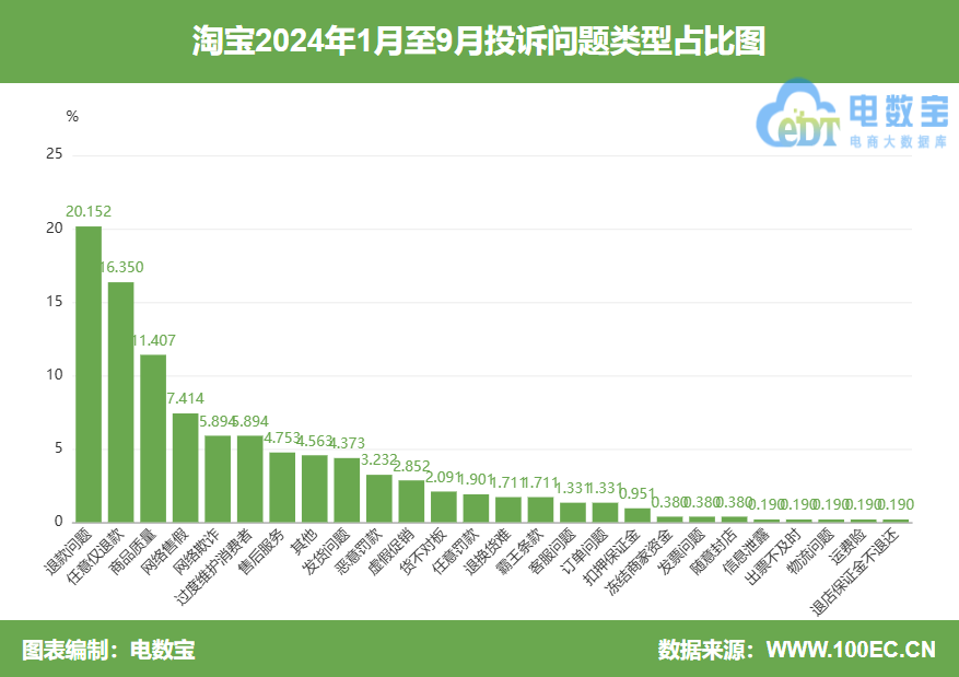 此外,“電訴寶”受理用户維權案例顯示,淘寶在2024年至今還疑似存在退款問題、任意僅退款、商品質量、網絡售假、網絡欺詐、過度維護消費者、售後服務、發貨問題、惡意罰款、虛假促銷、貨不對板、任意罰款、退換貨難、霸王條款、客服問題、訂單問題、扣押保證金、凍結商家資金、發票問題、隨意封店、信息泄露、出票不及時、物流問題、運費險、退店保證金不退還等問題。