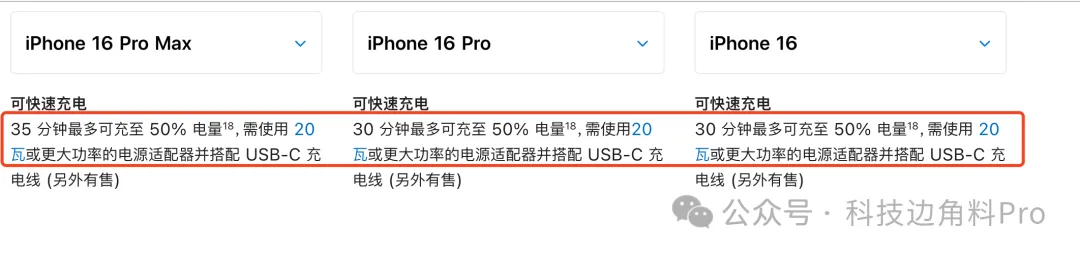 蘋果官網目前並未提到iPhone 16系列手機快充升級內容,只顯示“30分鐘(Pro Max/Plus 為35分鐘)最多可充至50%電量,需使用20瓦或更大功率的電源適配器並搭配USB-C充電線”。