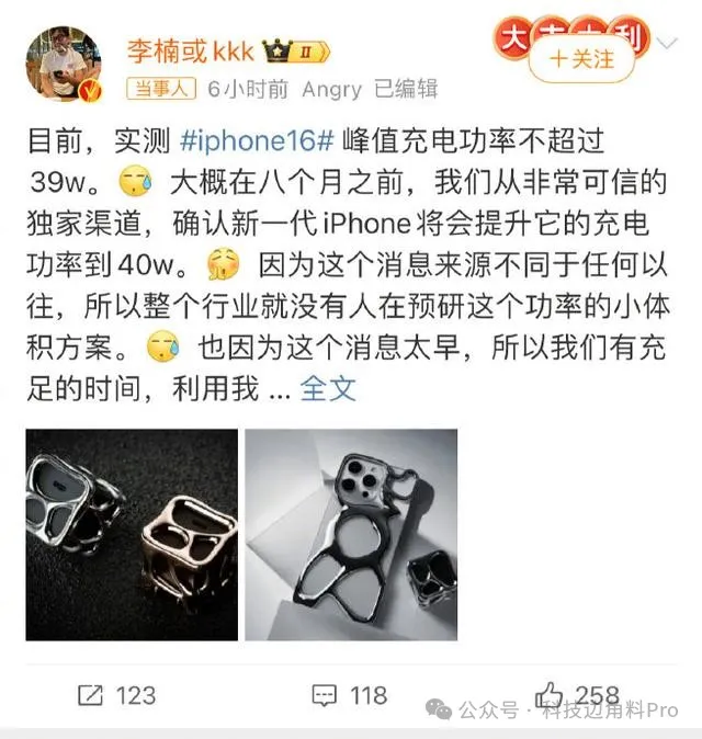 然而魅族前高級副總裁李楠發文認為實測iPhone 16峯值充電功率不超過39W,介於38W和39W之間。