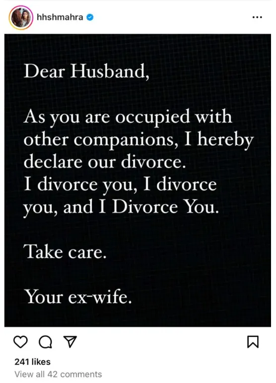當地時間2024年7月17日,迪拜公主謝赫·瑪哈拉(Sheikh Mana)突然在社交媒體上發文,宣佈自己要跟剛結婚一年多的丈夫離婚。