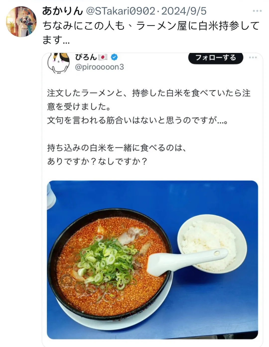 比如,這位怒斥中國情侶沒素質的日本博主,自己就在前幾天抱怨拉麪店不讓他自帶米飯…