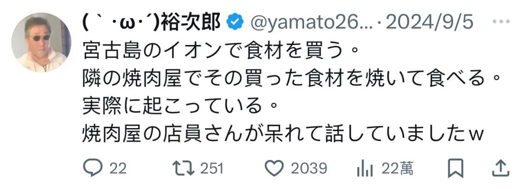 比如這位日本網友表示,他曾在宮古島某永旺超市購買食材,然後直接拿到隔壁烤肉店烤着吃,哪怕店員看到都目瞪口呆。