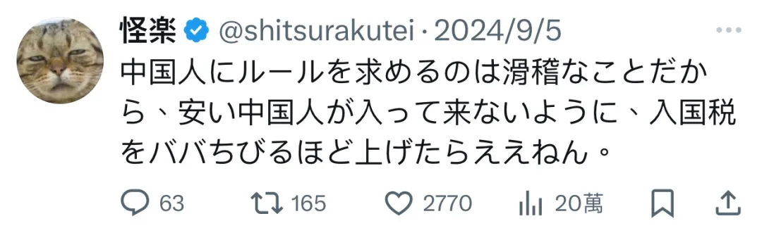 日本網友建議,為了避免類似的情況再發生,應該提高中國遊客的入境門檻、徵收“入境税”,防止低素質的遊客進入日本。