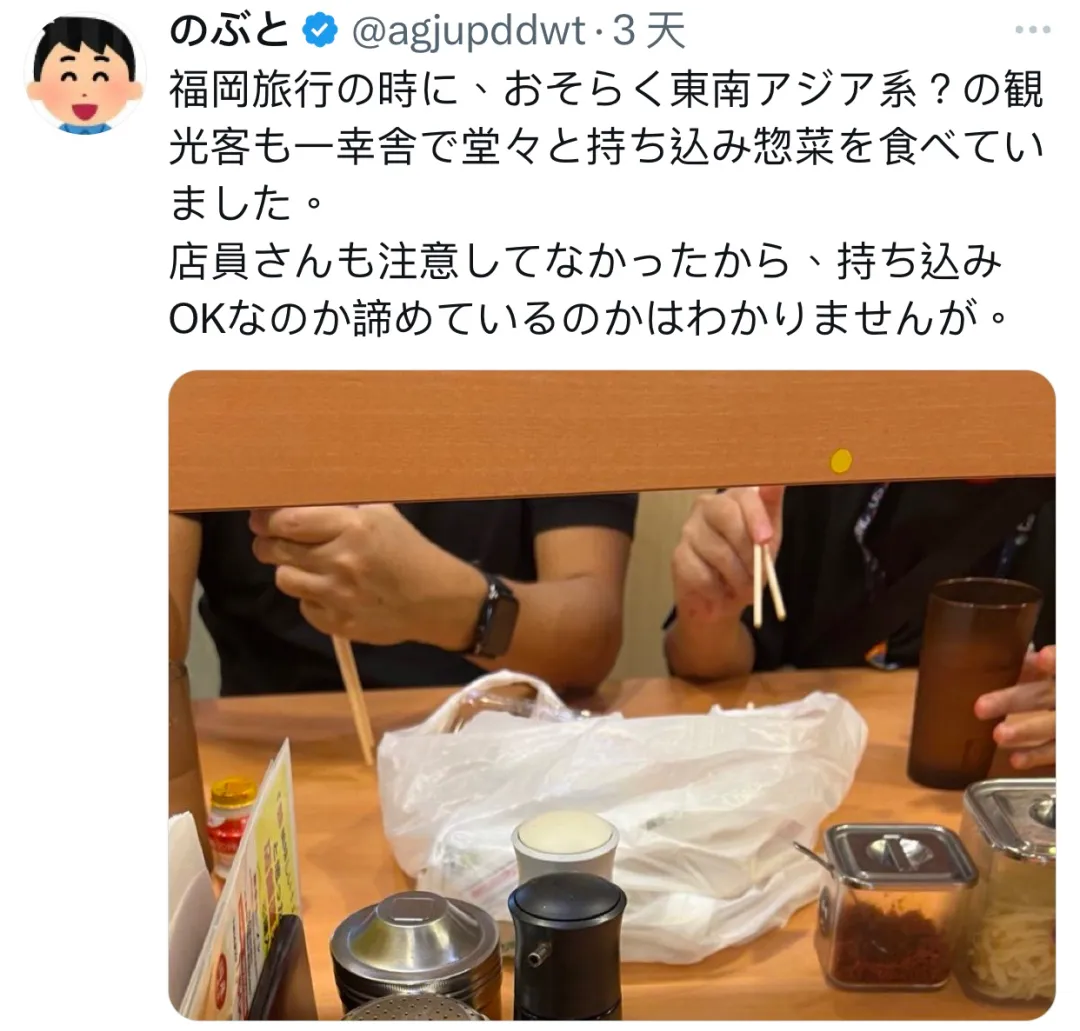 這位網友此前在福岡旅行,對桌疑似為東南亞遊客,他們也是自帶食物在店內用餐。