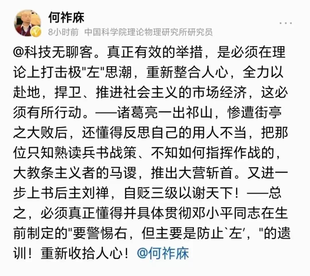 更可怕的是,這幾年,由於疫情、美國對我圍堵等原因,經濟增長速度不如以前那麼快了,何祚庥居然將之歸咎於一些關注國有資產流失的網友,甚至動了殺機,鼓譟要把他們“推出大營斬首”。