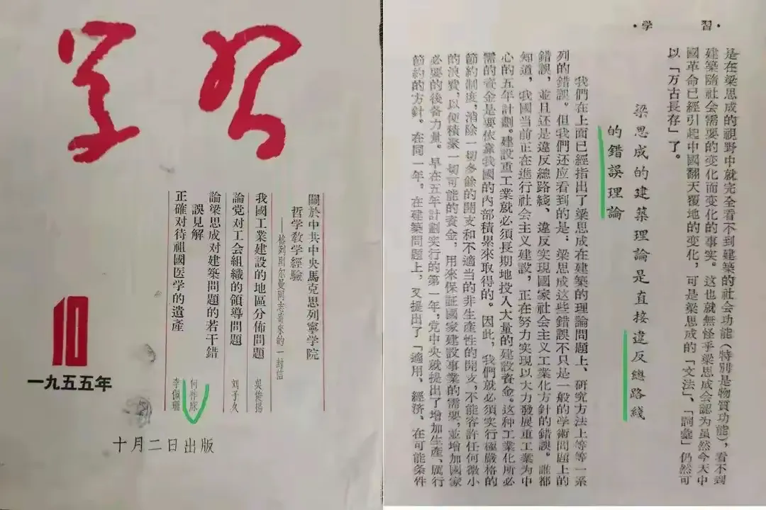 “我們在上面已經指出了梁思成在建築的理論問題上、研究方法上等等一系列的錯誤。但我們還應看到的是,梁思成這些錯誤不只是一般的學術問題上的錯誤,並且還是違反總路線、違反實現國家社會主義工業化方針的錯誤。”