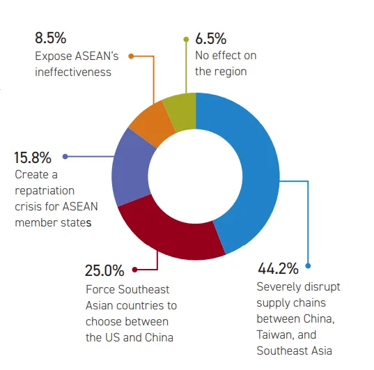 **②選項(從左至右):**會給東盟國家帶來遣返危機;在應對台海危機方面“無能”;被迫在中美之間“選邊站”; 嚴重破壞台海兩岸和東南亞之間的供應鏈;台海衝突不會對該地區帶來任何潛在影響。