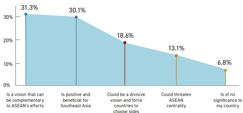 ▲左一:可以與東盟方案相輔相成;左二:對東南亞來説是積極和有益的;左三:有可能迫使各國在中美之間選邊站;左四:可能威脅東盟的中心地位;左五:看不到該願景的意義。