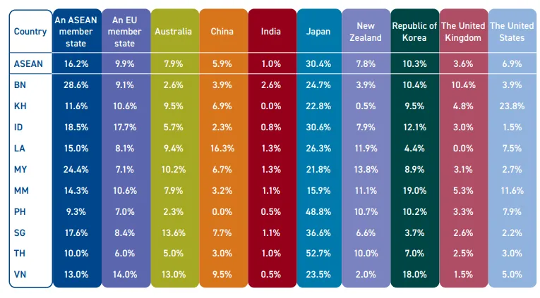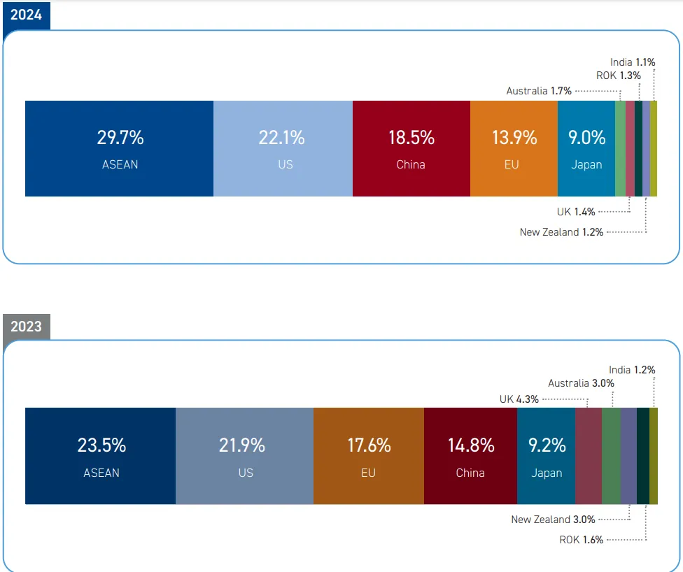 在這方面,菲律賓受訪者(26.0%)的首選國家是日本;泰國受訪者的偏好在東盟國家和日本之間平均分配(均為 21.9%)。