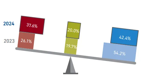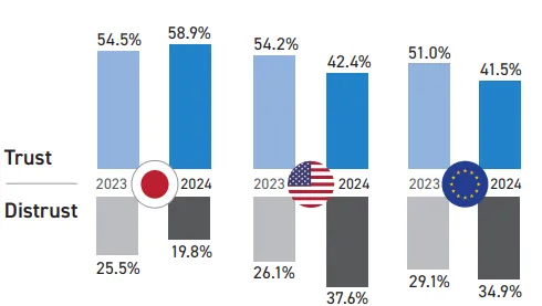 總體上,東南亞國家對美國的信任度繼續保持強勁,只不過,相比去年(54.2%),今年的比例大幅下降至42.4%。而不信任程度從2023年的26.1%大幅上升至今年的37.6%。