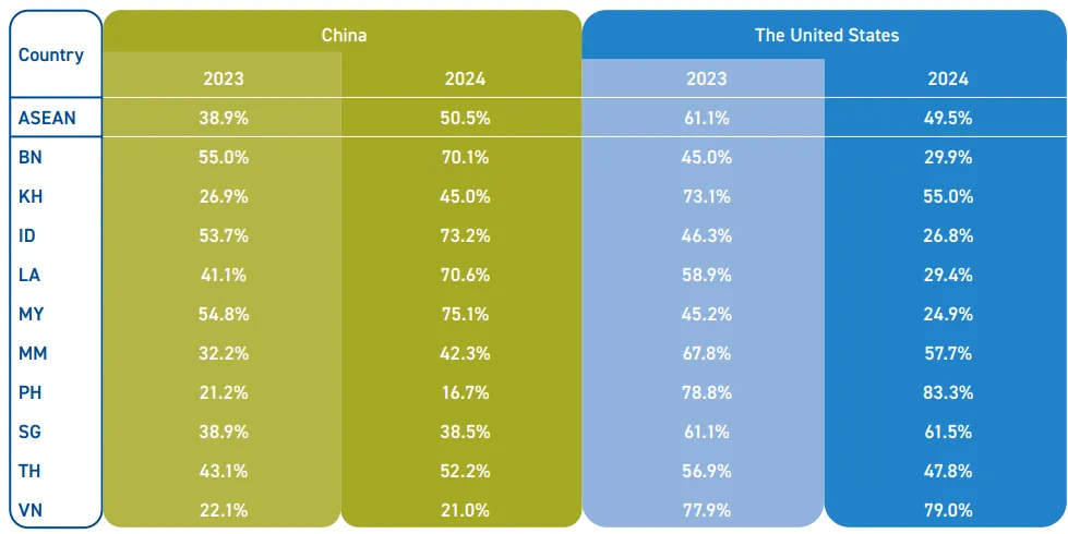 “首選中國”的趨勢在馬來西亞(75.1%)、印度尼西亞(73.2%)、老撾(70.6%)、文萊(70.1%)和泰國(52.2%)的受訪者中尤為明顯。報告認為,這主要受益於中國的“一帶一路”倡議(BRI)和對華投資和貿易關係。與2023年相比,這四個國家對中國的偏好度增加了20個百分點以上。