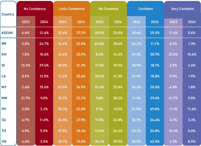 在該調查關於“您對美國作為戰略伙伴和地區安全的提供者抱有多少信心?”的提問中,越來越多的東南亞人展現出“很少或完全沒有信心”。40.1%的受訪者認為美國不那麼可靠,而2023年這一比例為32.0%。在這方面,印度尼西亞 (60.7%)、文萊 (58.5%) 和馬來西亞 (52.5%) 感觸最深。