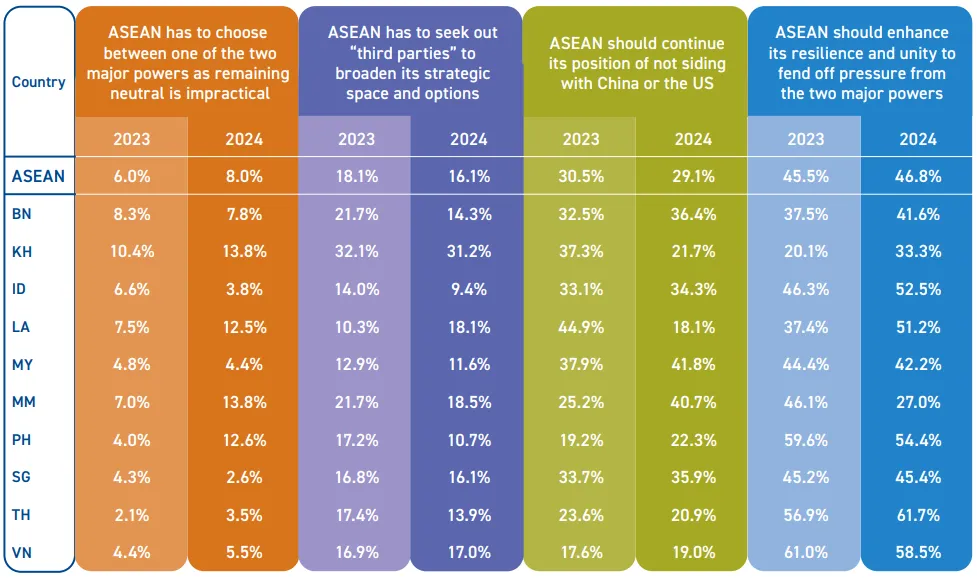 選項四:8%(2023年為6%)的人認為東盟保持中立已經不切實際,應該選邊站。最不支持這一選項的受訪者來自新加坡(2.6%)。相對而言,支持該選項的受訪者主要來自柬埔寨和緬甸(均為13.8%)和菲律賓(12.6%)。