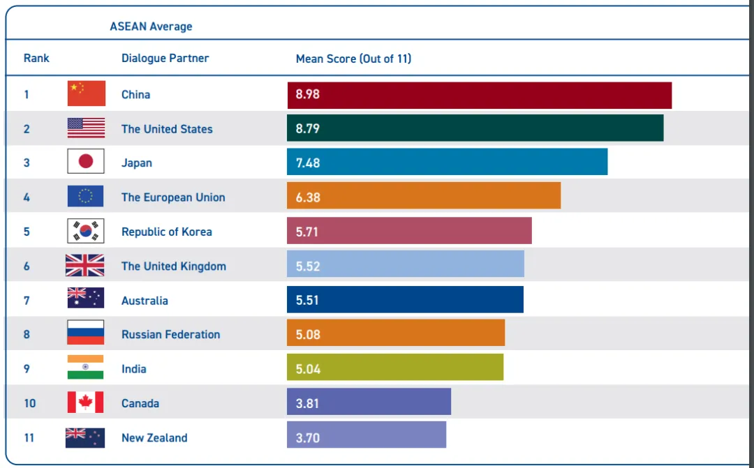 4. 在東盟的11個對話夥伴中,中國(8.98 分,滿分11.0分)對東盟的戰略相關性最為主要,其次是美國(8.79分)和日本(7.48 分)。和東盟戰略相關性最低的夥伴是:印度(5.04分)、加拿大(3.81分)和新西蘭(3.70分)。