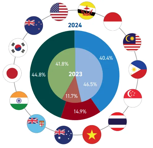 在信任美國的受訪者當中,45.0%的人認為美國擁有巨大的經濟資源,且有能夠提供全球領導力的政治意願。這一比例比2023年(39.2%)有所增加。對美國持如此高的信任度的受訪者主要來自老撾(59.6%)、越南(51.1%)、泰國(50.0%)、馬來西亞(50.0%)和柬埔寨(46.7%)。
