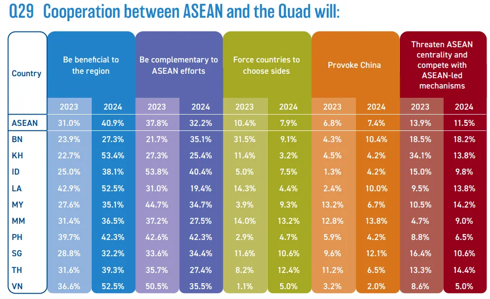 11.5%的受訪者認為,與Quad的合作可能威脅東盟的中心地位,並與東亞峯會 (EAS)、東盟地區論壇 (ARF)等東盟主導的機制形成競爭。而擔心這種合作可能會挑釁中國的比例從2023年的6.8%略微上升至7.4%。其中,緬甸(13.8%)、新加坡(12.1%)和文萊(10.4%)的受訪者最擔心這種合作對中國而言是一種挑釁。