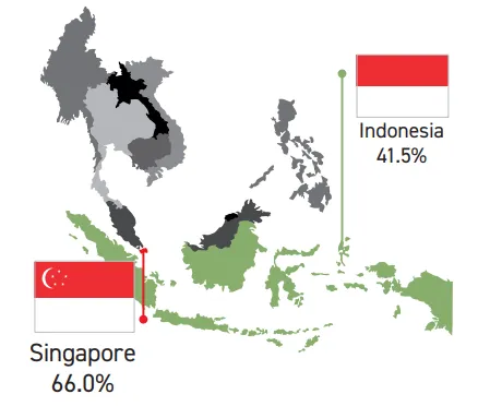 6. 引領東南亞發展和進步的國家是兩個創始成員國:新加坡(66.0%)和印尼(41.5%)。