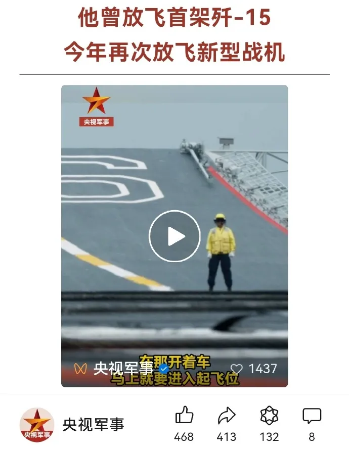介紹詞寫道,張乃剛是海軍“遼寧”艦放飛殲-15型艦載機的“第一人”,而在他軍旅生涯的最後階段,他又完成了海軍某新型艦載機的首次航母艦上起飛。提及此事,張乃剛難掩激動的心情,他表示這款海軍新型艦載機“非常漂亮”,放飛的那天天氣“非常晴朗”。