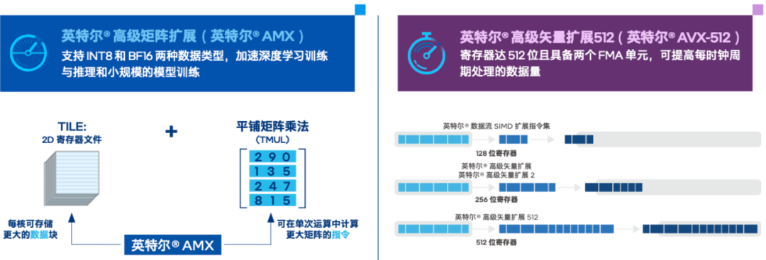 更重要的是,第五代至強®還內置了多個專用於AI加速的引擎。特別是英特爾®AMX(高級矩陣擴展),採用分塊矩陣乘法的創新方式,通過Tile矩陣乘法單元(TMUL)對數據實施矩陣運算。並且AMX支持INT8、BF16等低精度數據類型,在保證精度的前提下顯著提高每時鐘週期的指令數。